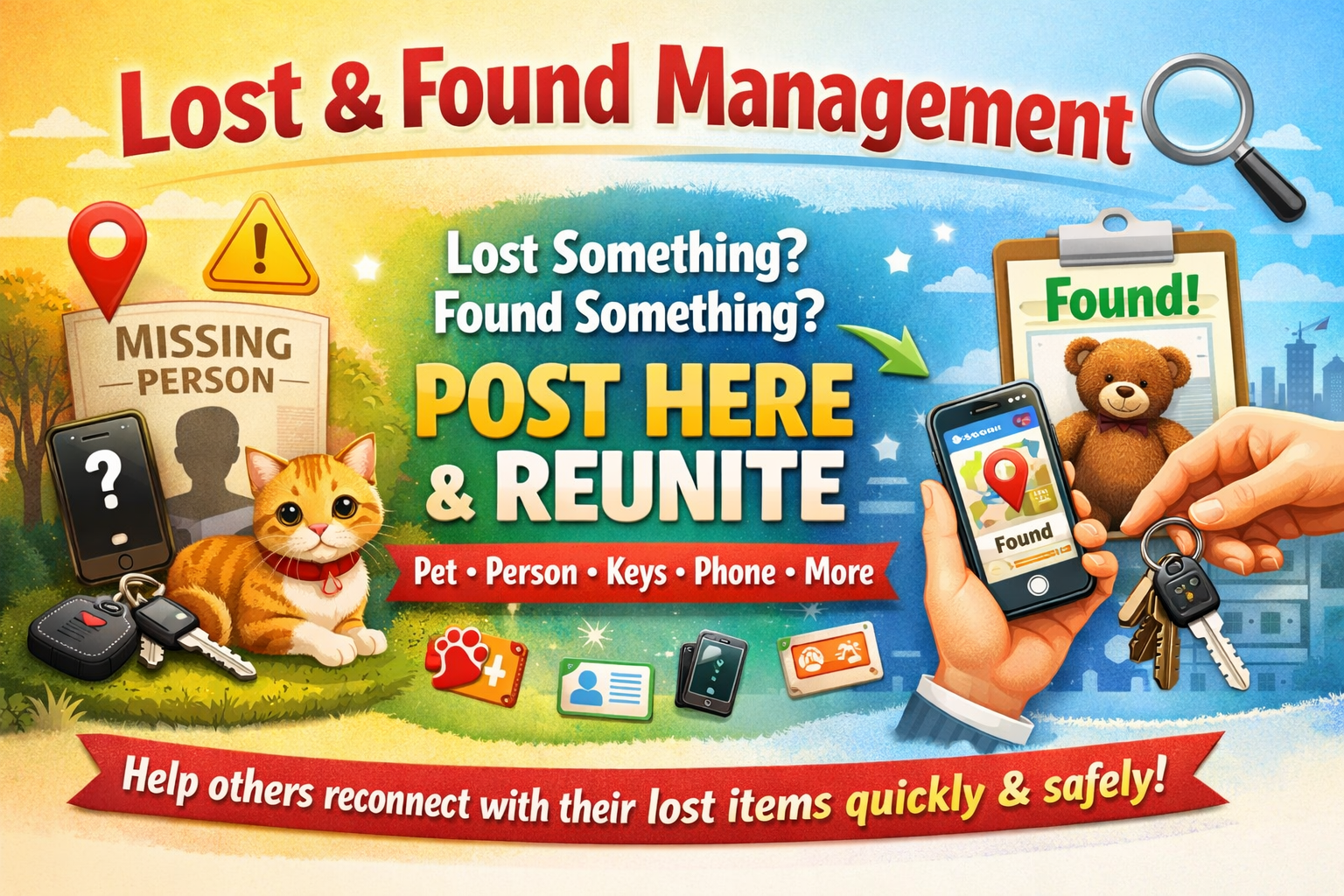 Post lost or found items including pets, keys, phones, or valuables. Quick recovery with image, description & contact info.